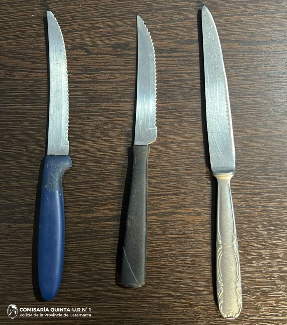 En la esquina de Dr. Federico Espeche y Sigfrido Schunck, efectivos de la Comisaría Quinta detuvieron a Serrano (31), Mastrotti (36) y Segura (43) tras una persecución motivada por evasión. Se les encontró tres cuchillos tipo tramontina entre sus ropas, incautados conforme a disposición del Ministerio Público Fiscal del Distrito Oeste.