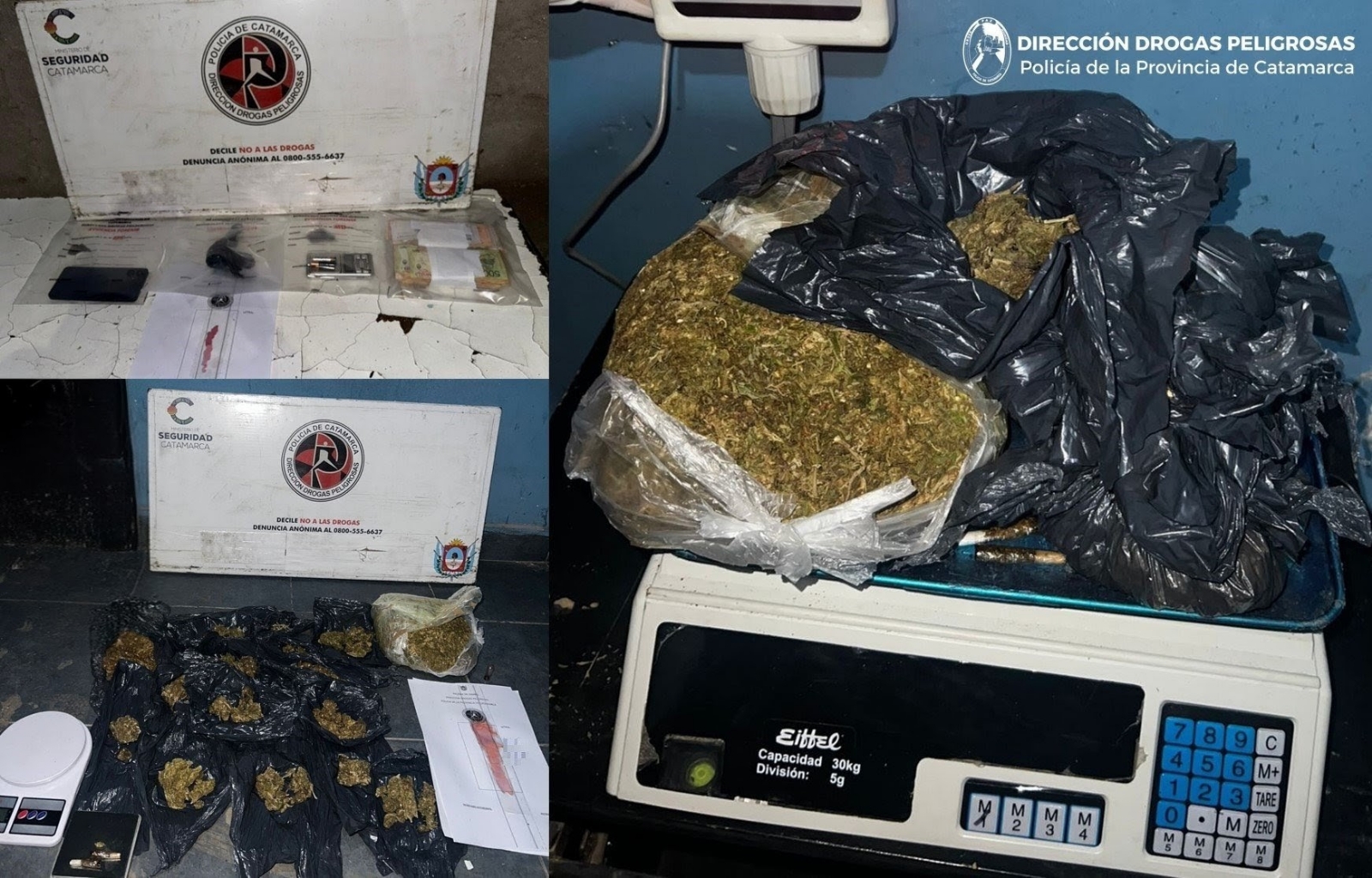 En los inmuebles, los policías incautaron 1,153 Kg., de aparente Marihuana, cuatro (04) balanzas digitales, un millón cuarenta y nueve mil cuatrocientos setenta ($1.049.470) pesos en efectivo, dos (02) teléfonos celulares y un (01) cartucho 7.62 mm.