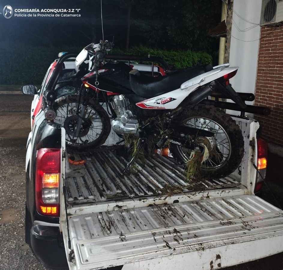 Ayer, alertados por un llamado telefónico, numerarios de la Comisaría de Aconquija llegaron hasta el paraje Buena Vista donde observaron que en el paso del Río El Campo hacia el paraje El Durazno, una motocicleta Motomel Skua 150 cc., estaba siendo arrastrada por el caudal de agua.