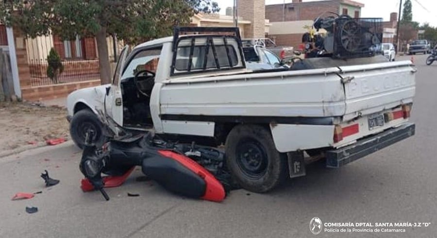 Hoy, a las 08:10, en calle 25 de Mayo S/N°, de la ciudad de Santa María, Cristian Aníbal Álvarez (22), que circulaba en una camioneta Peugeot 504, colisionó con una Honda Wave 110 cc., al mando de un adolescente de 15 años.