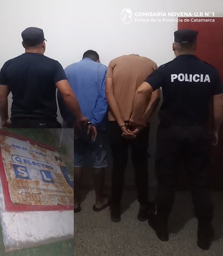 A las 22:20 de ayer, entre las Manzanas “B” y “F” del loteo Parque Sur, numerarios de la Comisaría Novena aprehendieron a dos sujetos de apellidos Flores (30) y Vera (34), quienes habrían sustraído un cartel de un local comercial, ubicado en avenida Hipólito Yrigoyen al 400.