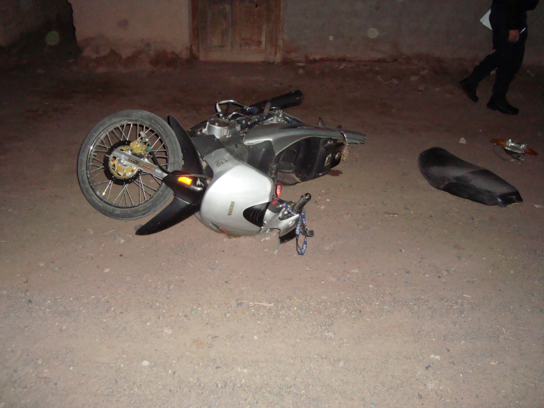 A la hora 21 de anoche, la Comisaría local tomó conocimiento de un accidente de tránsito en el B° Entre Ríos de esta población donde Alberto Cardozo de 30 años de edad, oriundo de la localidad de Anillaco (Ctmca) quien se conducía en una motocicleta 110 cc; protagonizó un accidente al embestir una camioneta que se encontraba estacionada frente a un domicilio de ese barrio, lo que produjo un fuerte golpe derrapando el cuerpo de Cardozo unos 25 metros.