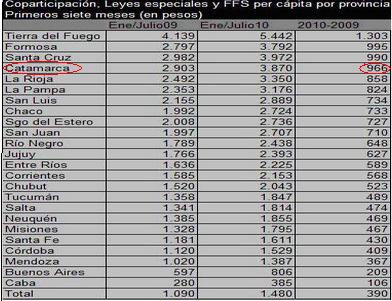 En cuanto a la distribución del FFS entre los habitantes de cada una de las provincias, en lo que va del año en promedio cada argentino recibió de la Nación 62 pesos más que lo recibido en igual período de 2009.