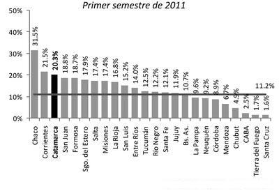 Como es sabido, las provincias del norte del país presentan las peores condiciones en cuanto a pobreza en la niñez. En Chaco, por ejemplo, el 63,3% de los niños menores de 18 años en 2011 habitan en hogares pobres. Este indicador retrocede para Catamarca, ya que queda ubicada en el octavo lugar del ranking nacional con un 46,1%. Mientras que la media nacional fue de un 31,6%.