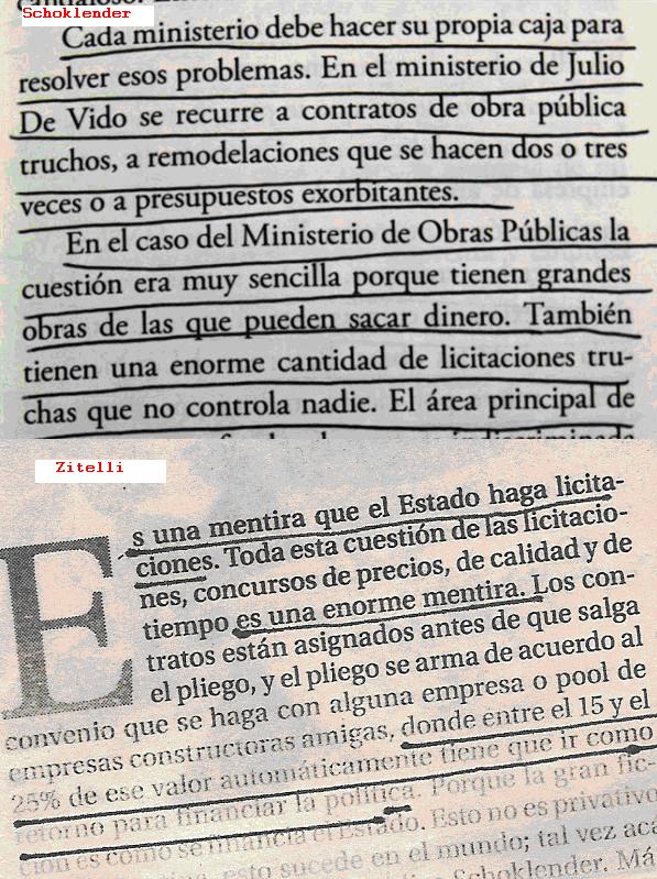 Esto escribió Schoklender en su libro de reciente aparición: “Sueños postergados”: \"Cada ministerio debe hacer su propia caja para resolver esos problemas. En el Ministerio de Julio de Vido se recurre a contratos de obras pública truchos, a remodelaciones que se hacen dos o tres veces a precios exorbitantes...\"