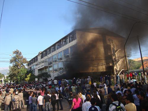 Los revoltosos continuan protestando y la situación se ha tornado tensa. Los uniformados intentan dispersar a los enardecidos contratados de obras públicas que exigen pasar a planta permanente.