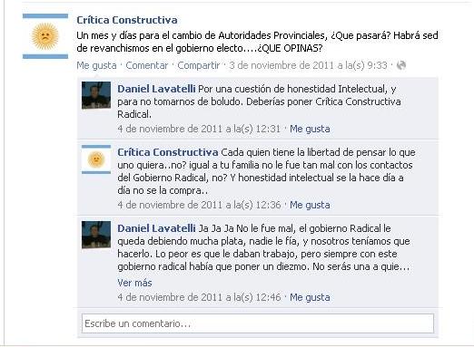 Lavatelli, indignado, la emprende contra el cibernauta que se identifica como “Crítica Constructiva”. En autodefensa Crítica Constructiva le dice a Lavatelli: “a tu familia no le fue tan mal con los contactos del Gobierno radical (textual)”. Se refiere concretamente a los negocios que hizo la empresa publicitaria Lavatelli con el gobierno del FCS.