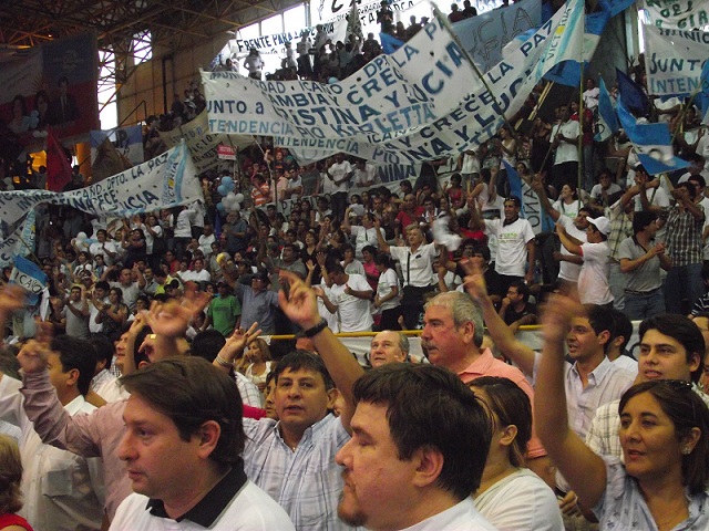 El presidente del Partido Justicialista en Santa María, Jorge Andersch, militantes y particulares, estuvieron presentes en el Polideportivo cuando la gobernadora Lucía Corpacci emitió su discurso.