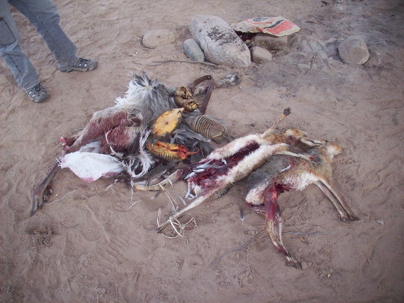 Al realizarles la inspección vehicular, los Inspectores dieron con piezas de animales considerados vulnerables y protegidos, cuatro quirquinchos, dos liebres maras y un suri polluelo, todos estos cazados con perros de raza galgo, método también prohibido por las legislaciones vigentes de Catamarca.
