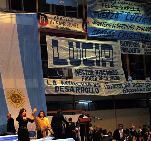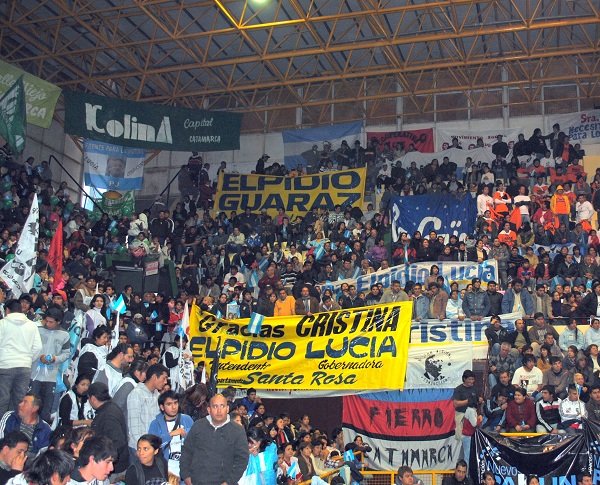La mayoritaria presencia catamarqueña estalló en el momento que la presidenta llegó al estadio y comenzó a saludar a los asistentes de las distintas provincias. Con un PJ sin bombos, ni trompetas, como en otros tiempos, y hasta compartiendo “cartelera” con el Frente para la Victoria en pliegos de reducidas dimensiones, La Campora apareció como la más fervorosa y con identificación más ostentosa. Después le siguieron Kolina (de Alicia Kirchner), con una importante porción del sector sureste, y, más dispersos, el resto de los grupos “kirchneristas” de Tupac Amaru, Fierro, Peronismo Militante, Nuevo Paklín, JP Evita y JP Descamisados, entre otros.