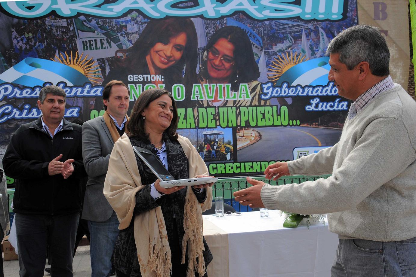 En el marco de su visita al departamento Belén, esta mañana la Gobernadora Lucia Corpacci presidió un acto en la plaza principal de la ciudad, donde realizó el lanzamiento del Programa de Profesionalización de Auxiliares de Enfermería, entregó netbooks a escuelas de la región y equipamiento a emprendimientos locales y rubricó convenios con cooperativas, entre otras actividades. Estuvo acompañada por el Vice Gobernador Dalmacio Mera, el intendente José Ávila y el presidente de la Cámara de Diputados de la Provincia Néstor Tomassi, miembros del Poder Ejecutivo Provincial, funcionarios municipales, intendentes de localidades aledañas y vecinos de la ciudad de Belén.