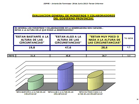 En la encuesta, los catamarqueños son interrogados si, “en general, los ministros y colaboradores de la gobernadora son capaces… están a la altura de lo que exige la gobernadora? Los resultados, no son favorables para los interesados y tal vez por eso, la propia Lucia Corpacci, ya les hizo saber lo que piensa de sus gestiones. Recuérdese que ya en dos oportunidades les reclamo “más compromiso”. Solo para el 19,8 de los entrevistados, los funcionarios kirchneristas, “están bastante a la altura de las circunstancias”.