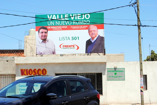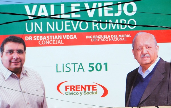 En las ya inminentes elecciones de renovación parlamentaria, en la jurisdicción de Valle Viejo se votará para tres categorías: a diputado nacional, a diputados provinciales y a concejales. La mayoría de los partidos políticos difunde su oferta promocionando, por los menos, a los principales postulantes para esos cargos, que no es el caso del Frente Cívico y Social (FCyS), que en las gigantografías dispuestas en distintos puntos del departamento presenta únicamente a Eduardo Brizuela del Moral y Sebastián Vega, los aspirantes radicales al Congreso Nacional y al Concejo Deliberante. Pero, deliberadamente, se ha omitido la imagen del ex intendente chacarero y actual postulante a la Legislatura Provincial, Gustavo Roque “el Gallo” Jalile”.