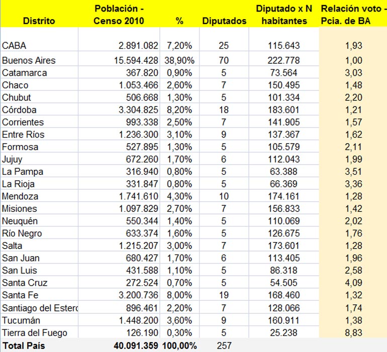 De acuerdo al último censo, con la actual composición de la Cámara un diputado en la provincia de Buenos Aires representa alrededor de 222.777 habitantes, mientras que, en el otro extremo, Tierra del Fuego sólo requiere 25.238 para un legislador. Es decir, en la práctica el diputado nacional bonaerense representa a una población ocho veces mayor que su par. Lo cual es igual a decir que los bonaerenses están ocho veces menos representados que un fueguino. La proporción es de 4 a 1 con Santa Cruz, de 3,5 a La Pampa, y es casi equivalente con Córdoba (1,2).