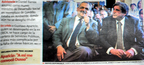 De entrada lo “barajó” en la tapa con un subtítulo donde daba cuenta de la asunción de los ministros Daniel Barros y Aparicio, adjudicándole a éste último “declaraciones tras asumir. Aparicio: “A mí me convocó Dusso”. En la página 3, con otra foto exenta de las bellezas que naturalmente no adornan la fisonomía del ministro, insistió: “Gustavo Aparico: “Me convocó Dusso”.