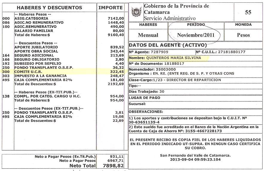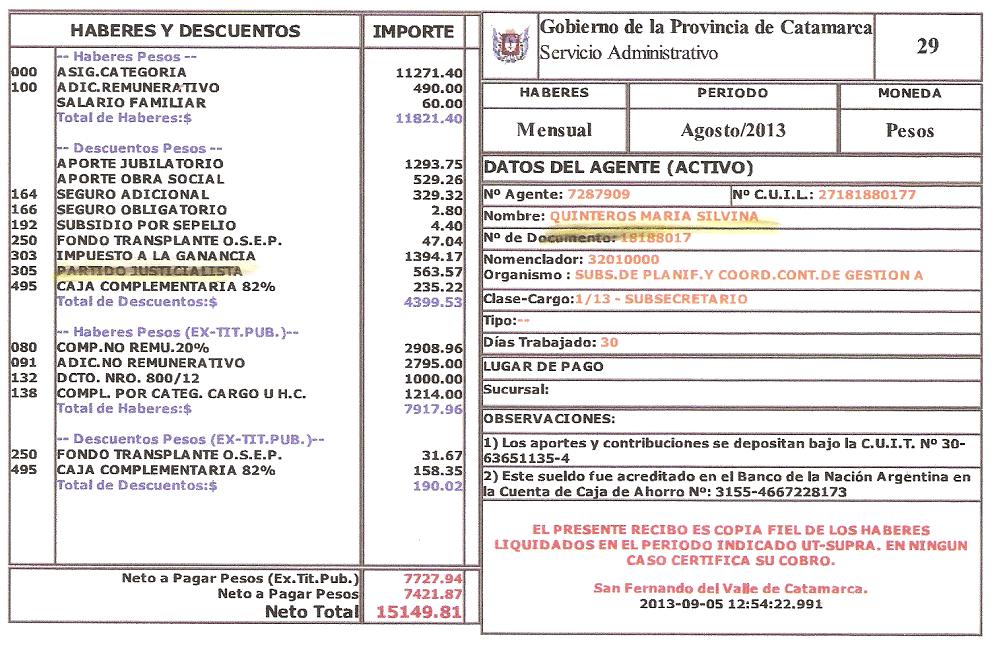 Para demostrar la participación de Silvina Quinteros en la gestión de Eduardo Brizuela del Moral, adjuntamos copia de su recibo de sueldo en aquellos años, donde se le descontaba el aporte partidario para la UCR; obvio, desde diciembre de 2011, aportaba para el PJ.
