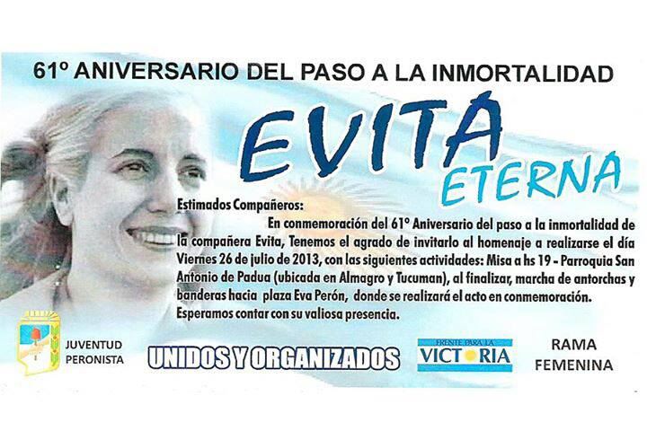 El Frente para la Victoria, la Rama Femenina del PJ, la Juventud Peronista y el peronismo en general invitan a participar de las actividades que se concretarán en el marco del 61º aniversario del paso a la inmortalidad de Evita.