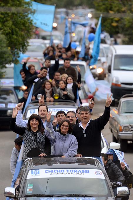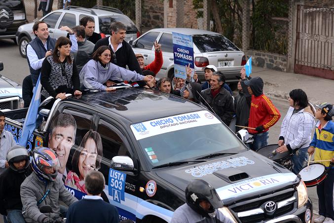 Néstor “Chicho” Tomassi y Silvia Moreta, candidatos a diputados nacionales, encabezaron la caravana acompañados por Lucía Corpacci, Dalmacio Mera y Raúl Jalil. La columna de vehículos pasó el barrio Ojo de Agua, luego Salsipuedes y finalmente Villa Cubas.