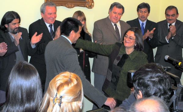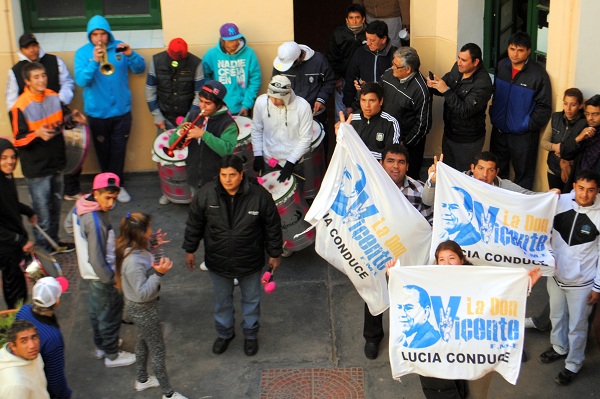 Luego, volvieron los cánticos de que “todos unidos triunfaremos…” cuando aparecieron la gobernadora Corpacci y el Dr. Saadi para las formalidades de la asunción, y se reiteraron después que el flamante ministro pronunciara el “sí juro”, esta vez ya amenizado por una improvisada banda musical de jóvenes seguidores de San Lorenzo de Alem, club al que hasta anoche presidió el funcionario, instalada con sus instrumentos en el Patio de las Palmeras de la planta baja.