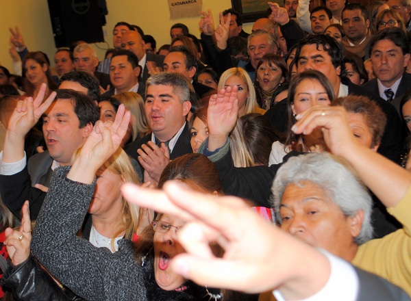Como pocas veces, al menos en la presente gestión, el salón de acuerdos “Fray Mamerto Esquiú” de la Casa de Gobierno resultó literalmente “chico” para albergar a los asistentes a la asunción de un funcionario provincial. Incluso, superando los vanos intentos del personal de ceremonial por dejar vacías las primeras sillas de la sala para los invitados especiales, los simpatizantes peronistas respondieron con la primera irrupción cantando “la marchita” tras el desafortunado y único anuncio de una locutora que “se debería desalojar el recinto”. Que “¡viva la militancia…!” le respondió la multitudinaria concurrencia.
