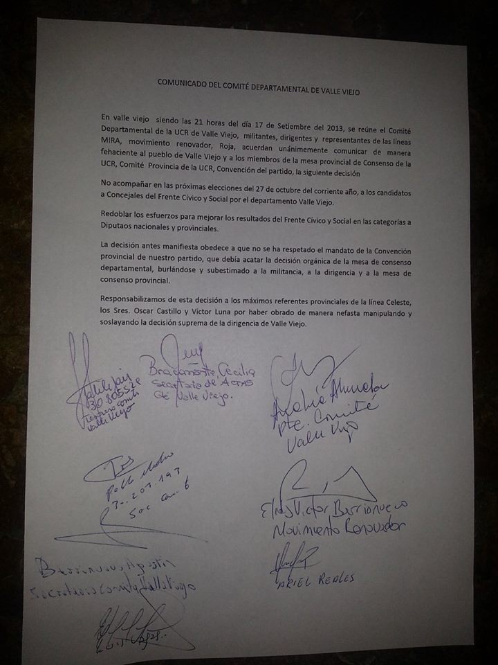En la nota enviada a nuestra mesa de trabajo, los sectores radicales chacareros sostienen que “no se ha respetado el mandato de la Convención provincial de nuestro partido, que debía acatar la decisión orgánica de la mesa de consenso departamental, burlándose y subestimando a la militancia, a la dirigencia y a la mesa de consenso provincial”.