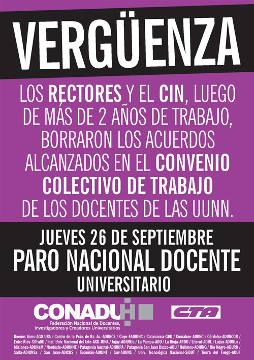 El próximoi jueves los docentes universitarios llevarán a cabo un paro nacional por 24 horas, en repudio al desconocimiento a los convenios colectivos de trabajo acordados oportunamente.