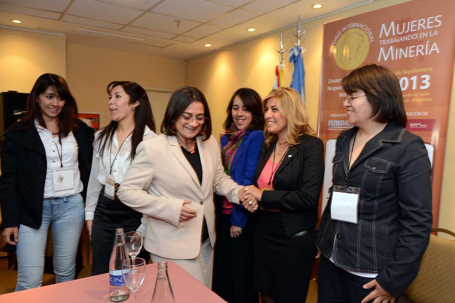 La conclusión del III Foro de Mujeres trabajando en la Minería estuvo a cargo de un panel integrado por mujeres que se dedican a la actividad en diferentes rubros que van desde el trabajo en mina hasta cargos jerárquicos, al que se sumó la Gobernadora, Lucía Corpacci, quien reconoció en la directora provincial de Gestión Ambiental Minera de la Secretaría de Estado de Minería, Teresita Regalado, el trabajo de la mujer en la actividad.