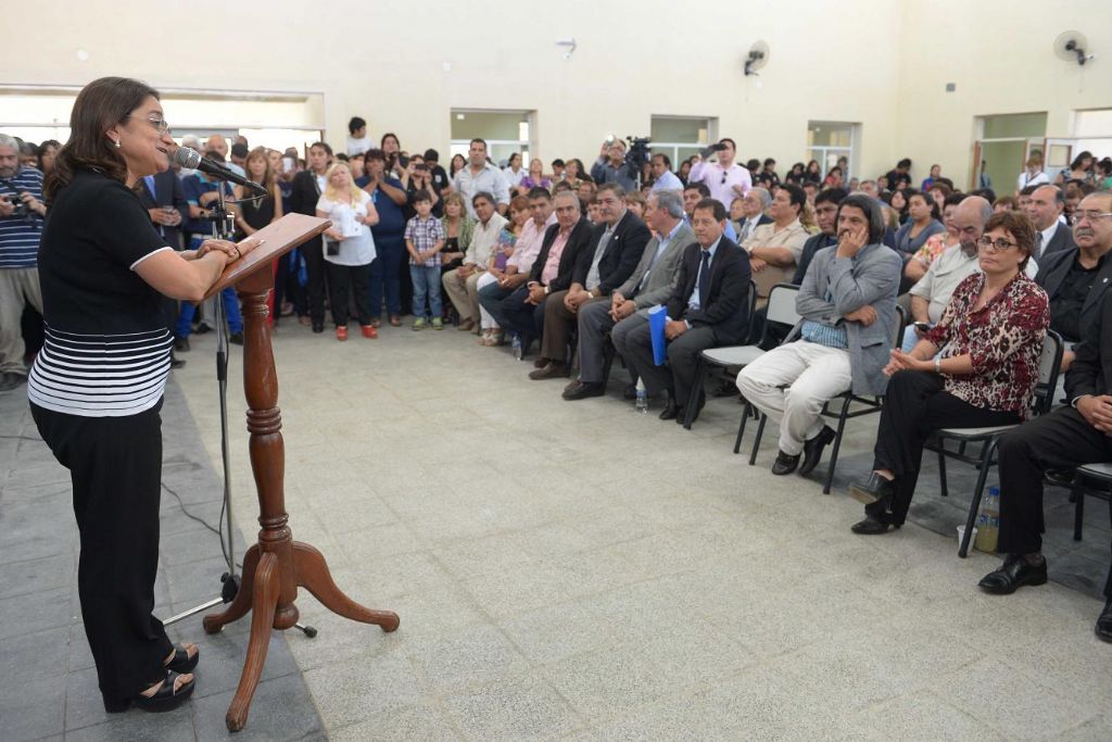 "La directora contaba un poco como era la historia, y yo quiero que sepan que para mí particularmente era una deuda enorme esta escuela. Y les voy a contra por qué… yo no era Gobernadora cuando ya se había empezado a gestionar en Nación, dentro del programa 700 Escuelas, la posibilidad de hacer este edificio. Y en verdad a veces las cuestiones políticas, esas de que ‘no quiero porque lo va a hacer, porque los fondos vienen de aquel que es mi adversario’, en realidad nos terminan perjudicando a todos. En ese interín me acuerdo que me insistían y me insistían… ‘hagan algo, no puede ser que no salga’. Bueno, hubo una persona que la voy a nombrar, que era Armando Mercado -yo no era funcionaria todavía-, y me llevó de la mano a hablar en Planificación Federal y peleamos por esta escuela junto a todo lo que peleamos. Quiero que sepan que no me atribuyo en ningún momento ser la única que peleó, porque yo sé la cantidad de gente que peleó y defendió la necesidad de esta escuela. Pero sí puedo decir que luego de que se empezó la construcción yo era una de las más interesadas en terminarla. Y bueno, a veces las cuestiones administrativas, burocráticas, nos ponen en estos bretes de no poder hacer nada. A esta escuela le faltaba bastante cuando la empresa constructora tuvo el problema que tuvo, que es de público conocimiento. Distinto fue el caso de la escuela de Recreo que sí pudimos intervenir rápidamente y terminarla. A esta le faltaba bastante, por lo tanto había que terminar los papeles”.
