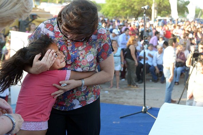 Cuando escuchábamos la vecina, cuando lo escuchábamos al nene y nos contaban lo que era esta zona antes, basurales donde precariamente vivía gente, donde precariamente vivían personas, donde precariamente viven personas. Y una vez más la Gobernadora de la provincia, una vez más se ocupa de los más desprotegidos, una vez más traza como política de Estado el acceso a la vivienda, a un barrio digno, al agua, a las cloacas, a la luz, al asfalto, al cordón cuneta, a los sectores más vulnerables de la sociedad.