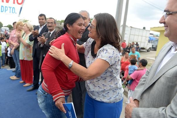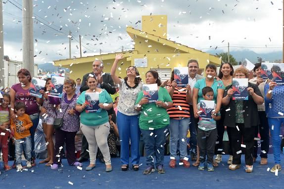 La Gobernadora de la provincia, Lucía Corpacci, presidió el acto de entrega de soluciones habitacionales a más de 50 familias del sur capitalino, en una tarde que vistió de fiesta a la plaza del barrio Santa Marta, y que tuvo momentos de gran emotividad, cuando las diferentes familias recibían las llaves de su casa.