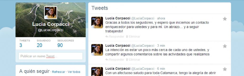 La cuenta @LuciaCorpacci contaba con 90 seguidores antes de que la Gobernadora escribiera su primer mensaje, por lo que la recepción fue muy buena, hecho que destacó la mandataria.