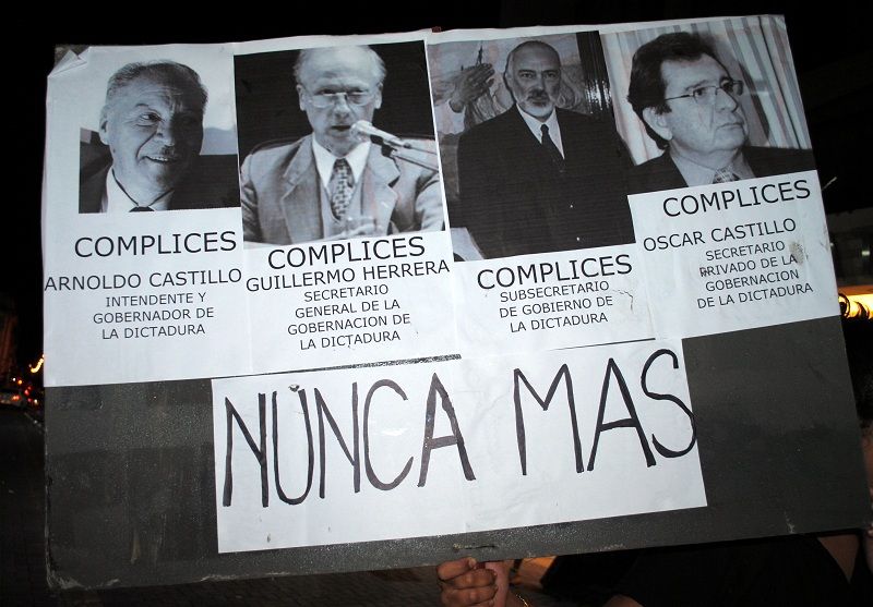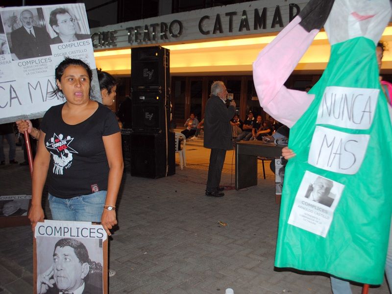 Con amplios carteles y pancartas, los presentes enarbolaban consignas con el vigente reclamo de "Nunca más” y señalaban a "Arnoldo Castillo, gobernador de la dictadura”. También apuntaban a los "cómplices” civiles del golpe de Estado del 24 de marzo de 1976 en la provincia, describiendo al pie de sendas fotografías los roles cumplidos por el mismo Arnoldo Castillo como "Intendente y Gobernador de la dictadura”, de Guillermo Herrera "secretario general de la Gobernación de la dictadura”, de Ricardo Guzmán "subsecretario de Gobierno de la dictadura) y Oscar Castillo "secretario privado de la Gobernación de la dictadura”.