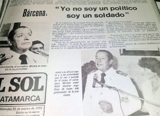 Esta cita textual de Bárcena aparece en el diario El Sol (ya desaparecido), del 25 de marzo de 1981, cuando el jefe militar dejaba la gobernación catamarqueña en manos del radical Arnoldo Aníbal Castillo, y figura entre las tapas de los medios locales reproducidas en la muestra gráfica "Entrelíneas”, que desde hoy y hasta el martes 1 de abril se lleva a cabo en el Archivo y Museo Histórico de la provincia, sito en Chacabuco 420, de esta Capital.