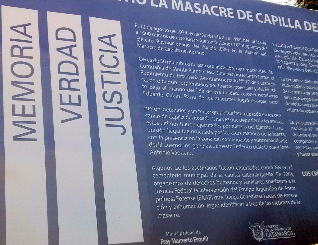 A un costado de aludida ruta quedó instalado un cartel en donde, bajo la consigna de "Memoria, Verdad y Justicia”, se describe que "el 12 de agosto de 1974, en la Quebrada de Los Walther, ubicada a 1.600 metros de este lugar fueron fusilados 16 integrantes del Ejército Revolucionario del Pueblo (ERP), en la denominada Capilla del Rosario”.