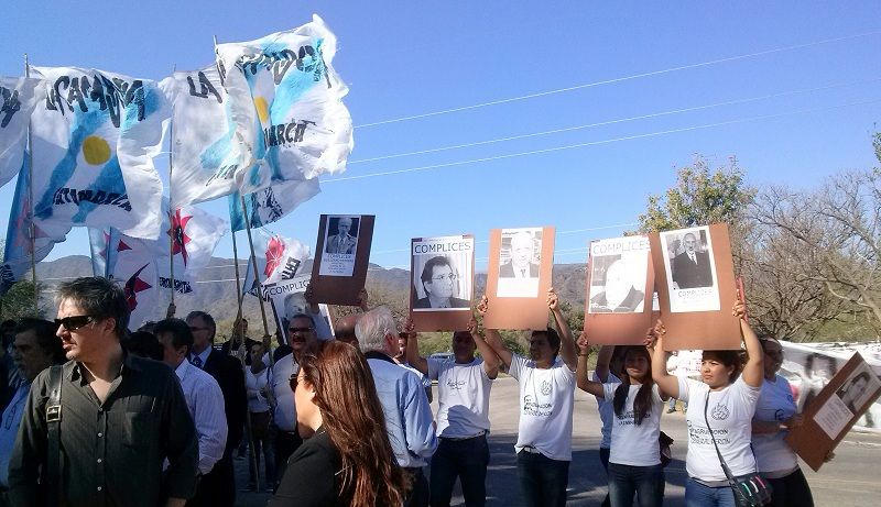 Sumados a la convocatoria, militantes de organizaciones políticas y sociales exhibían carteles con fotos de los ex gobernadores de facto Horacio Pernasetti y Arnoldo Castillo; como también de los dirigentes radicales Oscar Castillo, Eduardo Brizuela del Moral, Ricardo Guzmán, Amado Quintar y Guillermo Herrera, con la inscripción de "Cómplices”.