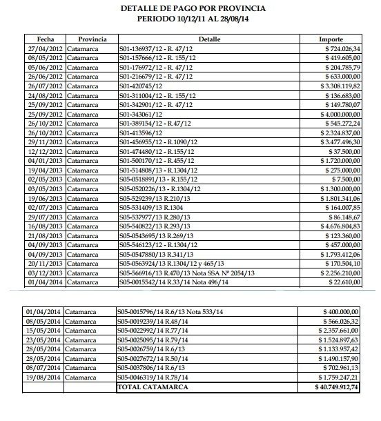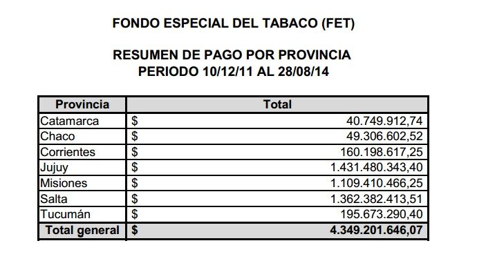 En la página oficial del organismo nacional, se puede ver publicado que Catamarca recibió desde diciembre de 2011 hasta agosto de 2014 una suma de 40.749.912,74, mientras que en 2014 los montos que deberían haber sido destinados para los tabacaleros van superando –hasta la fecha- los 9 millones de pesos.