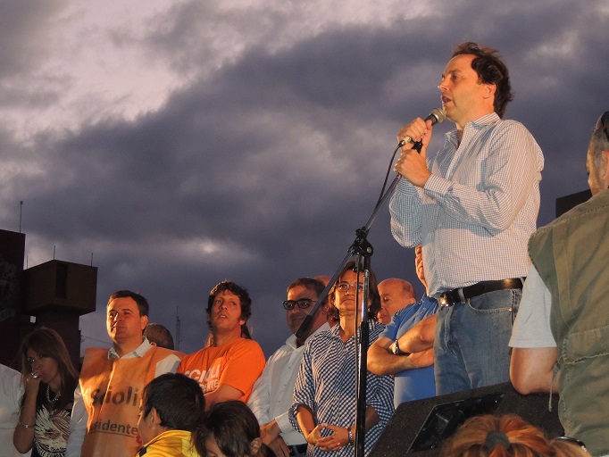 Mera instó a los militantes a seguir trabajando hasta el último día " Este es el compromiso, este es el desafío para los días que quedan: todos juntos y con la frente bien alta, con la alegría de ser peronistas, a decir Scioli presidente, Argentina gana!".