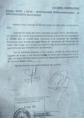 En este sentido, la actual intendenta de Valle Viejo, Natalia Soria, presentó hoy un escrito en la Cámara de Apelaciones en lo Penal, donde Jalile apeló el pedido de desafuero ordenado por el Juez Ramón Porfirio Acuña en 2013, y solicitó que remita las actuaciones al juzgado de origen a los efectos de que "fije fecha para la indagatoria y si al caso corresponde, determine la justicia la imputación y procesamiento del Sr. Gustavo Roque Jalile".