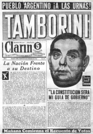 Tapa de Clarín del domingo 24 de febrero de 1946, el mismo día de las elecciones donde triunfó la fórmula Perón-Quijano. El diario de los Noble, ahora conducido por Héctor Magnetto, realizó una abierta y descarada campaña en favor de la fórmula Tamborini-Mosca de la Unión Democrática (UCR, Sociedad Rural, Partido Socialista, PC, embajada de Estados Unidos, etc.), una expresión inocultable del antiperonismo "al palo”, que desde el primer día manifestó ese diario por el Movimiento Nacional Justicialista.