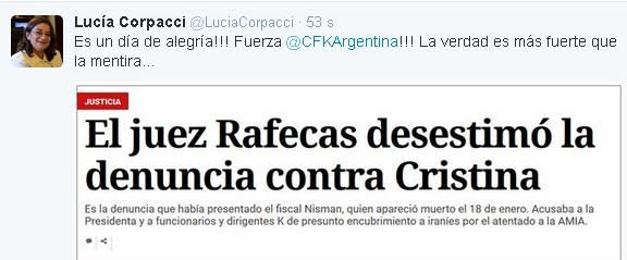 La Gobernadora Lucía Corpacci recurrió a su cuenta en la red social Twitter para celebrar la resolución del Juez Rafecas, que desestimó la denuncia que había realizado el ex fiscal federal Alberto Nisman, en contra de la Presidente de la Nación.