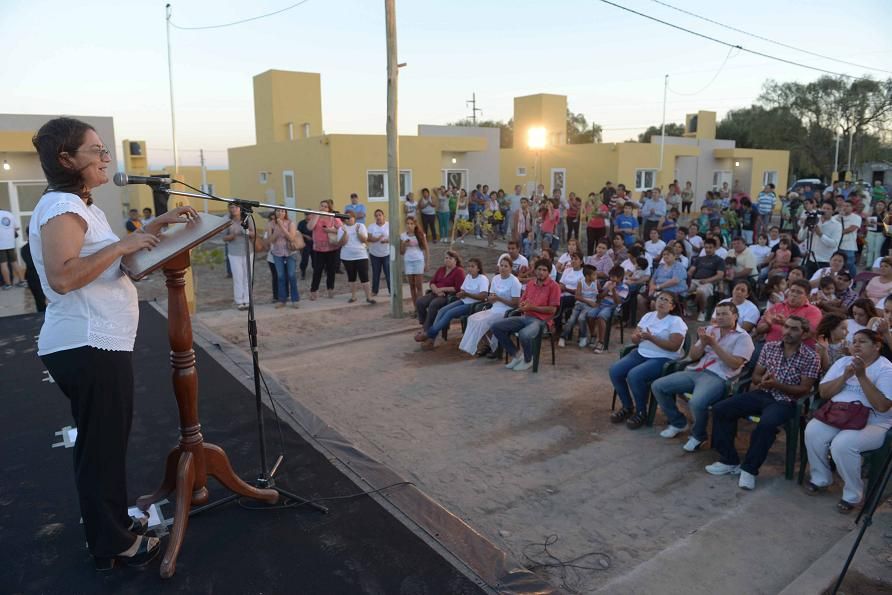 "Hace 15 días que la Provincia viene castigada por las inclemencias climáticas… ojalá que sólo sufriéramos un poco de viento y tierra, pero ustedes saben lo que nos pasó en Bañado de Ovanta, saben lo que nos pasó en Aconquija, saben lo que nos pasó acá nomás, en Valle Viejo… y algo del río les ha tocado a ustedes. Muy duro, muy dura la situación, el dolor de toda esa gente. Pero cuando yo iba iba ayer a Santa Rosa y veía las viviendas, decía ‘qué distinta calidad constructiva’. Ustedes tienen viviendas construidas de material cocido, son más amplias, son más cómodas, y las viviendas de bañado de Ovanta son viviendas hechas de paneles de cemento, totalmente distintas a estas. Y hoy, después de veinte años, están en verdad destruidas… por lo que pasó con el agua –porque no hay que negarlo-, pero porque en realidad porque la calidad constructiva no era la que uno quiere para todos”, señaló Lucía. Añadió posteriormente que "eso marca cuáles son las diferencias en las políticas de un gobierno y de otro. Hoy estamos les estamos entregando estas viviendas a ustedes, pero éstas forman parte de un programa de más de 12.000 viviendas que estamos entregando en toda la provincia, porque es en Capayán, es en La Paz, es en Belén…”.