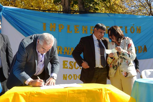 Lucía se trasladó luego a la plaza principal de Santa María,donde se realizó un acto para oficializar la implementación de las Jornadas Extendidas en la Escuela N° 240 de Loro Huasi- Nodo de Supervisión.