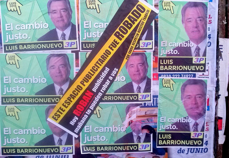 "Este espacio publicitario fue ROBADO”, describe una faja cruzada sobre la propaganda "barrionuevista”, añadiendo que "Hoy ROBAN publicidad…, mañana te pueden robar a vos”, para concluir "por favor, respeten nuestro trabajo”, reclaman los eventuales dueños de los sitios callejeros, particularmente en el casco céntrico de la ciudad Capital.