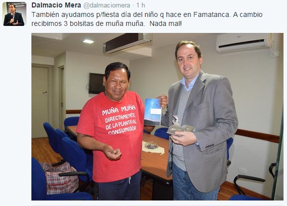 El Vicegobernador Dalmacio Mera colaboró con Antonio Cruz para la campaña que año tras año realiza para llevar juguetes a los niños de su Famatanca natal, en el departamento Santa María, y cambio recibió tres bolsitas de "Muña Muña". "Nada mal", escribió Mera en su cuenta de Twitter.