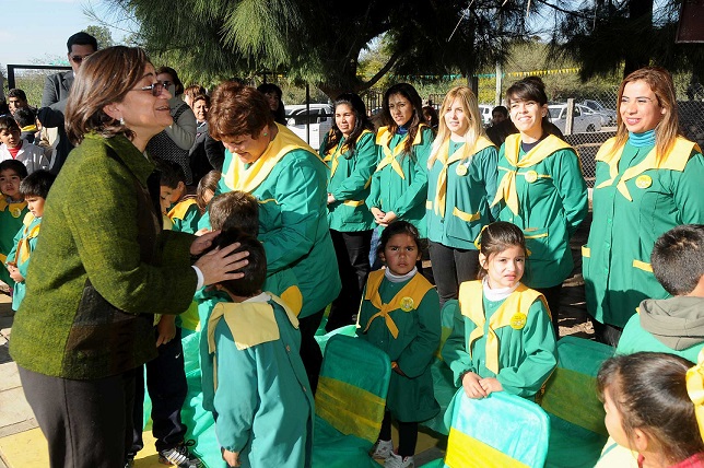 La verdad que yo, cada vez que voy a un acto escolar, pero particularmente los que tienen que ver con los jardines de infantes, me quedo admirada de ver estas cosas que hacen ustedes. Yo siempre digo mis manos, para estas cosas como adornar… siempre ponen tanto amor, miren cómo han vestido las sillas, se han tomado el trabajo de ponerle el moño, cómo han puesto la cartelera; y la verdad que solamente ustedes lo saben hacer. Y por donde voy eso se replica en los jardines de infantes.