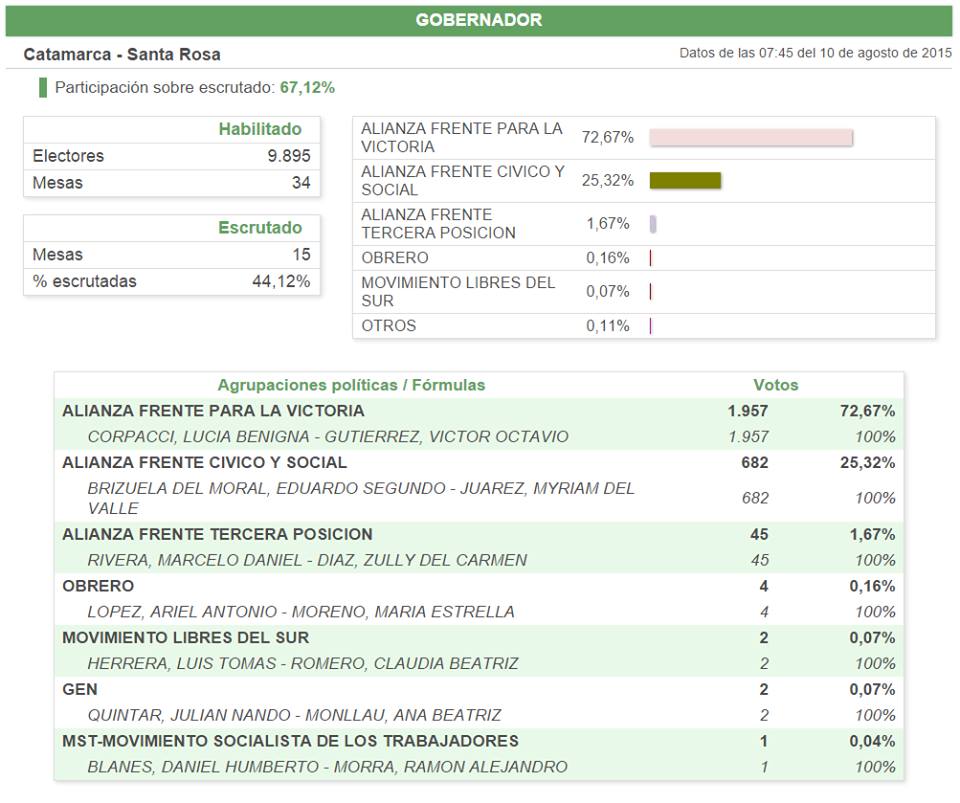 Cabe resaltar, que en el distrito de Los Altos fue donde mayor cantidad de votos cosecho la gobernadora Lucía Corpacci obteniendo una diferencia de casi el 50% con respecto a lo obtenido por parte de Brizuela del Moral que solo logró que lo votara una pequeña parte del electorado. Así demostró Olveira a sus ex aliados del Frente Cívico y Social que quien marca el terreno político es él y no Quintar o Brizuela del Moral.