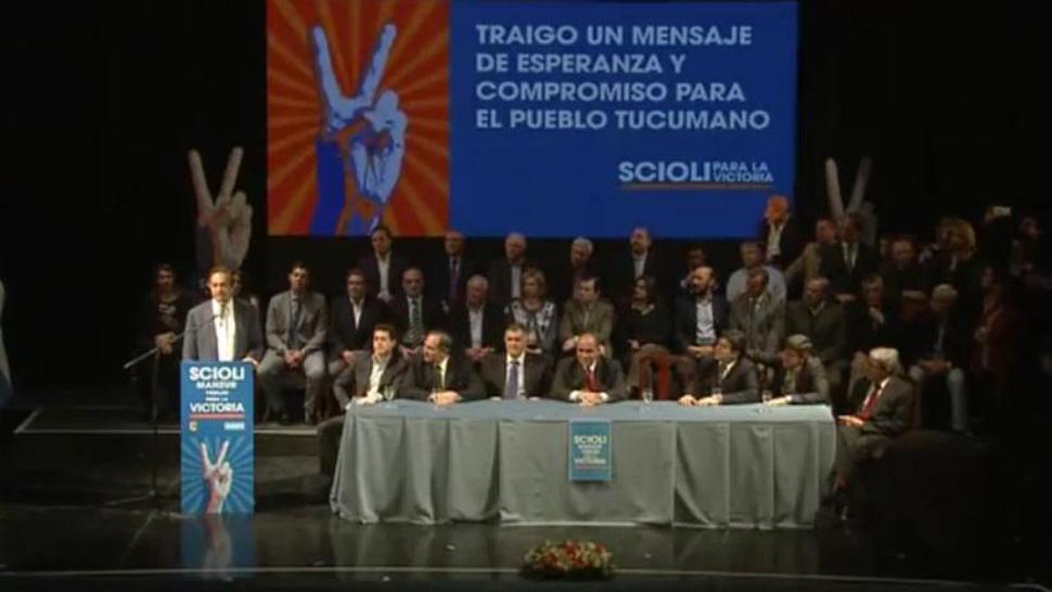 Durante su discurso, Scioli le dedicó principal atención a la alianza que encabeza el candidato opositor a la Gobernación de Tucumán, José Cano, la cual está conformada por la UCR, el PRO y el Frente Renovador, entre otras fuerzas políticas.