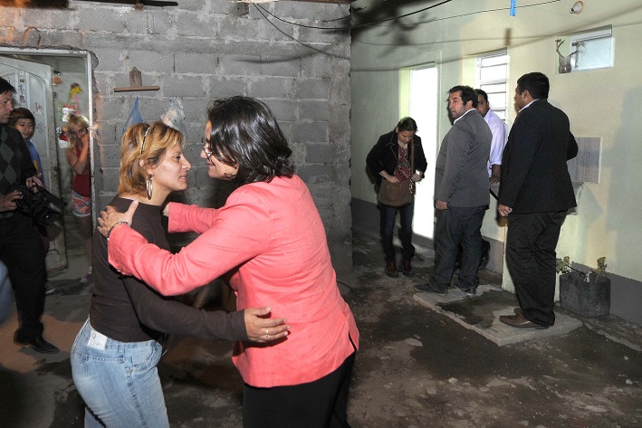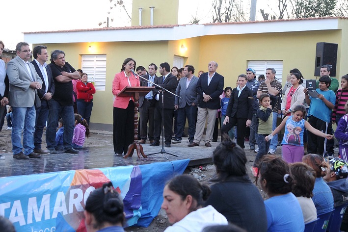 "Cualquiera de ustedes, viviendo en este barrio, saben que hubo un antes y un después, y eso no lo podemos negar. Yo recuerdo efectivamente cuando con Raúl vinimos al poquito tiempo de asumir acá, y había algo que a mí me impactó… porque había sido una lluvia muy fuerte y vinimos a ver. Estaban todos mojados, los colchones mojados, la ropa mojada; pero la instalación de la luz de las casitas, que eran palitos y nylon, era un cable colgado y un foquito que lo prendían y lo apagaban con la mano, descalzos, en el agua… la verdad que la angustia con que salimos de acá, pensando en ustedes, pensando en sus chicos, pensando en todas las desgracias que podían pasar; fue una de las cosas por la que tomamos la decisión de intervenir rápidamente en el barrio. De siempre yo recuerdo, llegaban los veranos, ustedes se inundaban todos, era la demanda, era el corte de ruta, era el nylon, el colchón, la ropa. Esa era la historia de ustedes, y fíjense poco a poco como va cambiando.