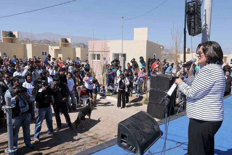 Posteriormente la jefa de Estado señaló que "no solamente estamos haciendo viviendas. Yo les comentaba que termina este acto y nos vamos hacia la Ruta 40, donde vamos a inaugurar el tramo de la ruta sobre Hualfín, y soy plenamente consciente, y estas cosas pasan, que acá en Santa María les falta un tramo de 10 kilómetros. La Presidenta no quiere que llegue diciembre, que ella termine el mandato sin que estén terminados esos 10 kilómetros. Pero quiero decirles que aun cuando nos faltan esos kilómetros, cierren un poquito los ojos y piensen lo que era antes transitar por nuestras rutas: no hay en Catamarca ninguna ruta nacional que no haya sido prácticamente en su totalidad intervenida. Puedo decir la Ruta 40, la Ruta 60, la Ruta 38, la Ruta 157, la Quebrada de La Cébila –que creo que no es nacional pero que fue intervenida con fondos nacionales-, que nos hemos podido contactar con el límite del Paso de San Francisco gracias a la 60, y que ahora ya se hizo el llamado a licitación para la Ruta 46 que une Andalgalá-Belén y seguramente los primeros días de octubre se abran los pliegos para poder adjudicar. Díganme si esa no es política de inclusión hacia el interior más profundo de nuestro país, entender y creer, apostar económicamente y con la decisión política; que las rutas nos hermanan, que las rutas nos permiten sacar nuestra producción, que las rutas nos dan acceso a otras cosas que antes eran imposibles”.