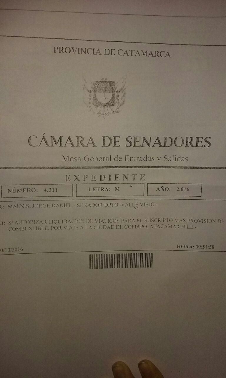 El senador de Valle Viejo (Frente Cívico y Social-Cambiemos) Jorge Daniel Malnis cobró viáticos de la Cámara Alta el pasado martes 25 mediante sendas órdenes de pago 2765 y 2766 (Expediente "M” 4311) por una importante suma de 5 cifras para participar en Chile de la IXX° Asamblea Plenaria del Comité Atacalar.